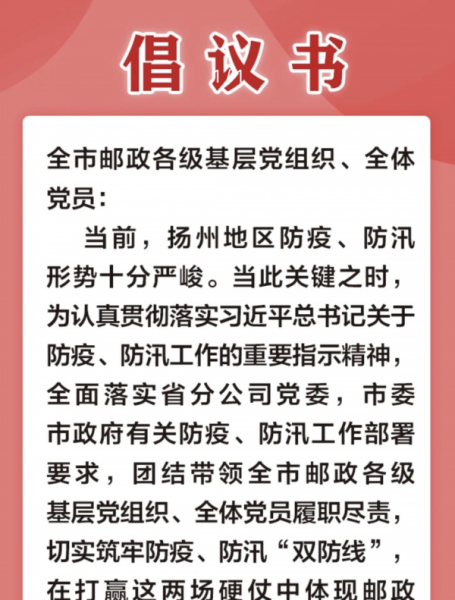 面對(duì)復(fù)雜的疫情防控形勢,揚(yáng)州郵政人堅(jiān)信有省分公司黨委和地方黨委政府的堅(jiān)強(qiáng)領(lǐng)導(dǎo),就一定能夠打贏疫情防控和經(jīng)營發(fā)展“雙勝利”。