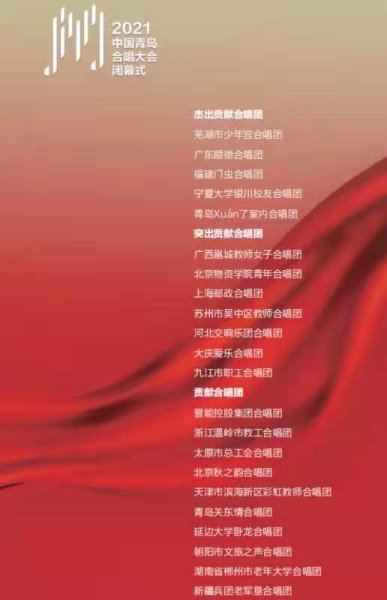 2021年7月23日-27日,2021年中國(guó)青島合唱大會(huì)在青島即墨音樂(lè)廳舉行。本次大會(huì)由中國(guó)音樂(lè)家協(xié)會(huì)、中共青島市委宣傳部指導(dǎo),由中國(guó)音樂(lè)家協(xié)會(huì)合唱聯(lián)盟、山東省音樂(lè)家協(xié)會(huì)、青島市文化和旅游局、青島市即墨區(qū)人民政府主辦,以慶祝建黨100周年為主題。