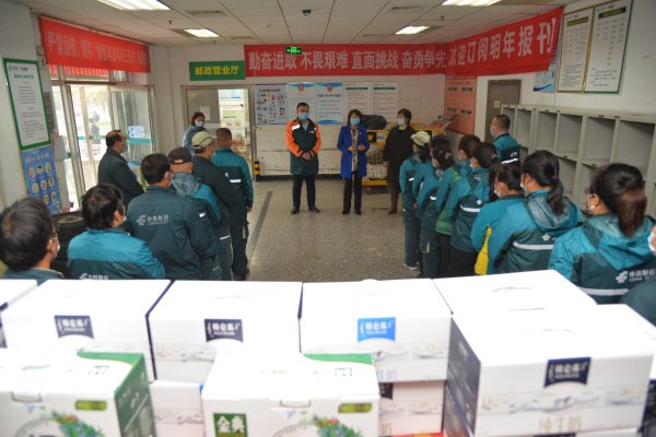 北苑支局由于所處地理位置靠近近期的疫情嚴(yán)控區(qū),被隔離職工較多,對(duì)于“雙十一”業(yè)務(wù)高峰期工作造成了一定困難,朝陽(yáng)區(qū)分公司工會(huì)及時(shí)為一線(xiàn)職工準(zhǔn)備了蔬菜生鮮、防寒圍脖帽。王艷主席在得知此情況后,第一時(shí)間為職工們送來(lái)了食品,并不斷向堅(jiān)守崗位的職工們表示真摯的感謝與贊賞,囑咐區(qū)分公司工會(huì)要及時(shí)向被隔離職工送去慰問(wèn)品與關(guān)懷。