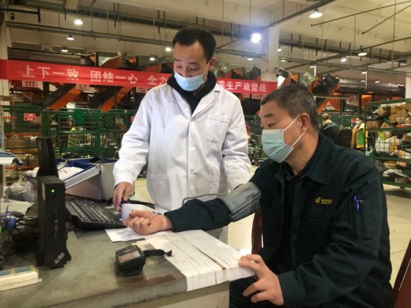 醫(yī)生在了解郵區(qū)中心職工情況和作業(yè)特點后,針對性地制定“雙11”期間職工健康注意事項,備齊各種急救藥品。除坐診外,同時安排專班車間巡場,為現場生產人員量血壓,傳授急救知識等,保障全體職工過安全“雙11”、溫暖“雙11”!