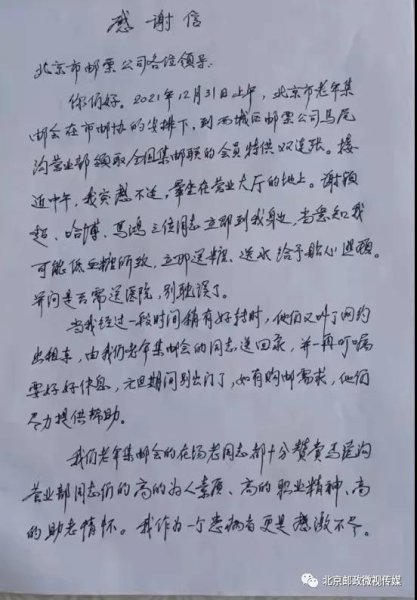 在剛剛過去的元旦假期里,北京市郵政分公司文傳部收到了一位來自北京市老年集郵協(xié)會石遐識老先生寫來的感謝信。感謝西城區(qū)馬尾溝郵政支局伸援手搶救暈倒老人,對馬尾溝支局干部員工“高素質(zhì)、高敬業(yè)精神、高助老情懷”給予高度肯定。