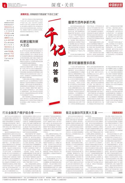 1月19日,《中國郵政報》以《千億的答卷》為題,對河南省分公司金融業(yè)務勞動競賽發(fā)展取得的優(yōu)異成績進行了整版報道。