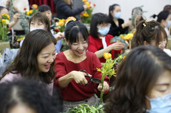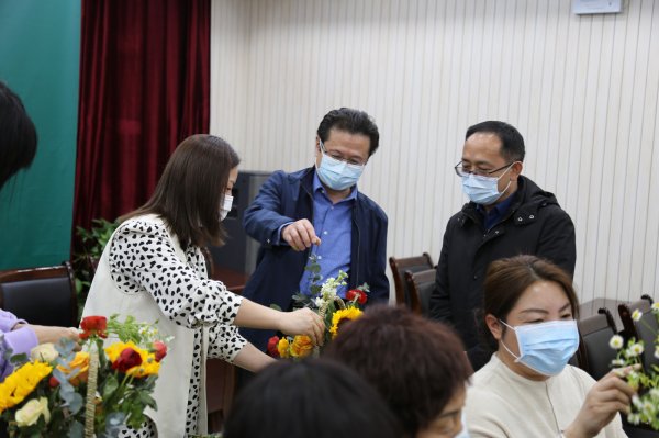 女員工們在李老師的悉心指導下, 用自己靈巧的雙手, 盡情發(fā)揮創(chuàng)造力,使原本普普通通的花草經(jīng)自己的巧手修剪后,錯落有致地搭配在了一起, 插出了漂亮美麗的花束。
