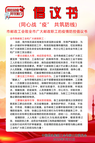 近日,馬鞍山市新冠疫情暴發(fā),給全市郵政生產(chǎn)服務(wù)造成較嚴(yán)重影響,致使投遞等服務(wù)開展艱難,全市約4.6萬件郵件積壓,11個網(wǎng)點(diǎn)停業(yè)。為了抗疫情、保生產(chǎn),馬鞍山市郵政工會第一時間向全市廣大郵政職工發(fā)出《同心戰(zhàn)“疫” 共筑防線》疫情防控倡議書,號召全市干部職工想方設(shè)法克服困難,組織全市人員加班送、駐點(diǎn)送,同時鄉(xiāng)鎮(zhèn)網(wǎng)點(diǎn)20多處職工住在職工小家,堅(jiān)守崗位,確保郵政服務(wù)不間斷。
