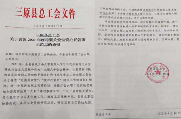 近日,陜西省三原縣郵政工會(huì)喜獲2021年度“母嬰關(guān)愛室縣級(jí)示范點(diǎn)”榮譽(yù)稱號(hào)。