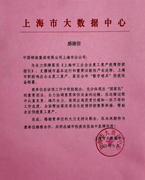 5月初松江區(qū)分公司收到上海市大數(shù)據(jù)中心發(fā)來(lái)的求助函,函中表述了為實(shí)現(xiàn)數(shù)據(jù)賦能復(fù)工復(fù)產(chǎn),擬在重點(diǎn)場(chǎng)所推行“數(shù)字哨兵”,但是由于緊急調(diào)配的一批保供設(shè)備在浙江省嘉興市嘉善縣,因物流原因無(wú)法及時(shí)發(fā)往上海,希望得到郵政的幫助。