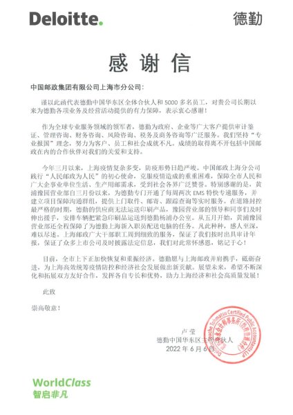 在六月復(fù)工復(fù)產(chǎn)之際,為了表達(dá)疫情期間豫園營(yíng)業(yè)部的大力支持與幫助,德勤公司專程寫(xiě)了一封感謝信,深切表達(dá)了感謝之情,感人至深。并表示希望雙方加大合作力度。(上海郵政工會(huì))