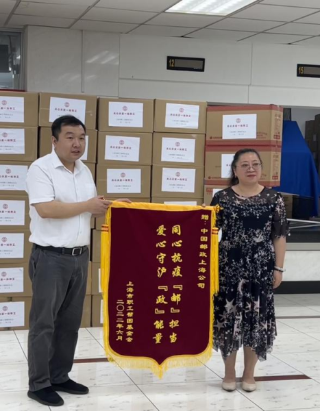 為表達誠摯的謝意,上海市職工幫困基金會向郵政工會贈予錦旗,上書“同心抗疫‘郵’擔當,愛心守護‘政’能量”。同時還捐贈了酸奶、面包、堅果等物資百余箱。雙方領導表示未來在微心愿寄遞、愛心超市直配、即時物流配送等方面會有更深度的合作,通過雙方的共同努力,將溫暖及時、高效送達有需要的人。(上海郵政工會)