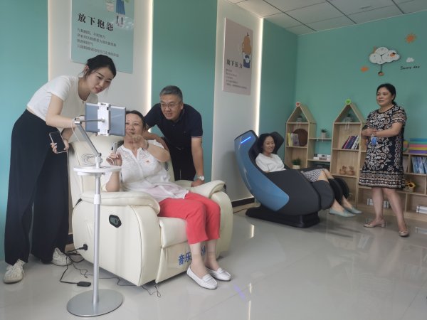 室內(nèi)最受員工歡迎的體感反饋性音樂(lè)放松椅上,總是坐無(wú)缺席。通過(guò)放松椅上的自動(dòng)測(cè)試屏,員工可以進(jìn)行心理測(cè)試,了解心理抗壓能力,還可以觀看心理疏解相關(guān)課程,參與解壓互動(dòng)游戲,讓工作壓力得以充分緩解。