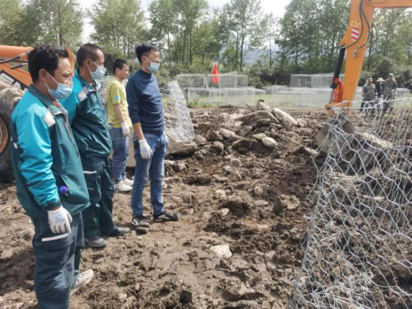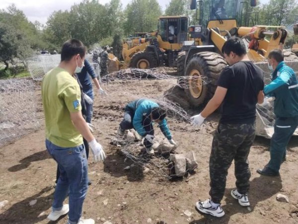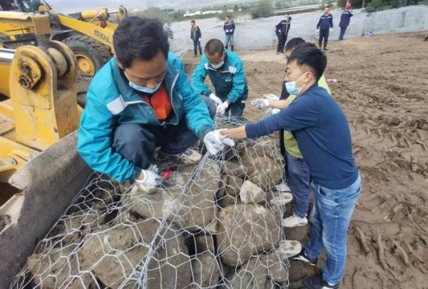 在防汛抗洪一線,員工們分工協(xié)作,有人做鐵籠有人搬石塊,有人將石塊填入鐵網(wǎng)中,利用填裝石籠加固河道。