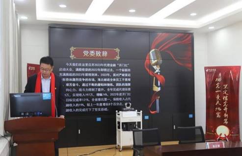首先,海北州分公司副總經理陳輝炯代表黨委進行動員,一是正視形勢、把握機遇,堅定“開門紅”必勝信心。要堅持州分公司黨委“抓基礎、提能力、強服務、促發(fā)展”的工作思路及“三早四有”的工作要求,主動作為、奮勇爭先,全面奪取開門紅的勝利;二是政策引領,精心組織,確保開門紅取得實效。全州上下要統(tǒng)一思想,樹立開局即決戰(zhàn)的理念,嚴格按照“四個到人”的要求,緊盯目標、狠抓進度,為2023年金融收入的完成打下堅實基礎;三是強勢推動,狠抓執(zhí)行,奮戰(zhàn)50天 勇奪開門紅。要學以致用,強化三個系統(tǒng)運用,上下同欲、風雨同舟,以時不我待的精神,抓實抓細抓落地各項工作,以歲末年初旺季為契機,搶抓客戶流、資金流、結算流,做強做優(yōu)做大AUM,實現(xiàn)代理金融高質量轉型發(fā)展。