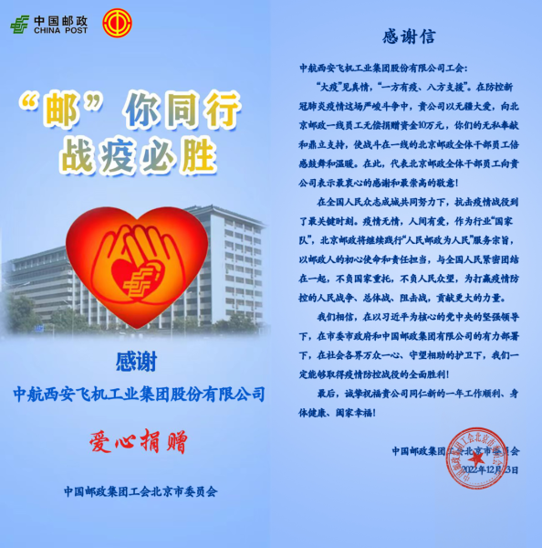 12月22日,北京市郵政工會(huì)收到中航西安飛機(jī)工業(yè)集團(tuán)股份有限公司工會(huì)捐贈(zèng)的10萬元,表達(dá)了該公司對北京郵政一線投遞人員的慰問與關(guān)愛。