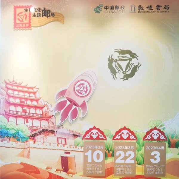 生肖文化主題郵局閱“兔”無(wú)數(shù),之所以采用敦煌“三兔共耳”圖作為場(chǎng)景主打,是因?yàn)槠淝擅钸\(yùn)用了兔耳借用與被借用的關(guān)系,三兔于環(huán)內(nèi)同方向相互追逐,像冬去春來(lái)一樣往復(fù)交替,又無(wú)始無(wú)終,有著鮮明的時(shí)間特征和古典文化深度,為許多兔文化作品提供了創(chuàng)作靈感。 生肖文化主題郵局將“3”這個(gè)數(shù)字與象征繁衍、治愈、傳奇的兔形象緊密結(jié)合。在生肖交替之際,該主題郵局LOGO輪新,送“中國(guó)大貓”之舊,迎“三兔呈祥”之新;在兩周歲生日之時(shí),啟用“三兔呈祥”文化郵戳,三只敦煌飛天兔成排共舞,俊逸縹緲;在新布置的場(chǎng)景內(nèi),敦煌藻井圖以馬賽克形式排列,“敦煌風(fēng)”撲面而來(lái),時(shí)尚與復(fù)古的完美結(jié)合讓人耳目一新。