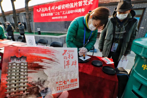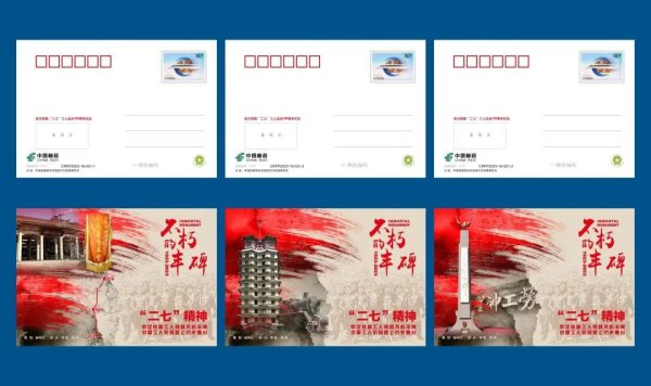 《不朽的豐碑》——紀(jì)念京漢鐵路“二七”工人運(yùn)動(dòng)100周年加印郵資明信片(一套3枚),濃縮呈現(xiàn)了北京長辛店、鄭州、武漢三地在工人運(yùn)動(dòng)中表現(xiàn)的“二七”精神,郵資圖為《高鐵追夢》。其中一枚以長辛店“二七”紀(jì)念館、會(huì)旗、京漢鐵路工人三地運(yùn)動(dòng)時(shí)鐵路線等素材設(shè)計(jì)的明信片,展現(xiàn)了作為北京近代工業(yè)發(fā)源地之一的長辛店的紅色文化內(nèi)涵。