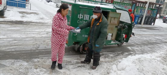 在康莊支局,投遞員將包裹遞給用戶并說道:“能及時把包裹送到您的手中是我們雪天投遞的最大心愿?!?/p>