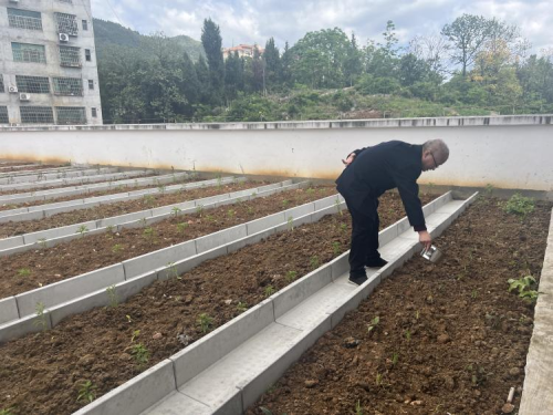 這是一個(gè)艷陽(yáng)高照的上午,綠植小組的成員們?cè)谔炫_(tái)澆著花,那是春天剛剛播種格?;?,一轉(zhuǎn)眼已經(jīng)快成為一片花海了。天臺(tái)的左邊是花園,右邊是菜園。菜園里番茄已經(jīng)結(jié)了果,草莓也快熟透。