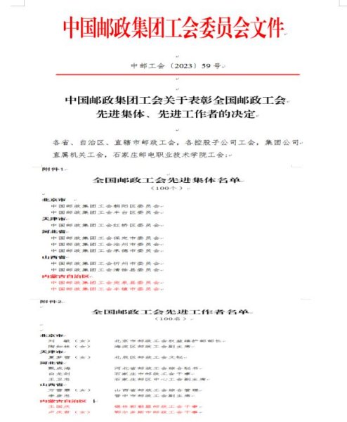 為表彰先進(jìn),樹立典型,近日,中國郵政集團(tuán)工會(huì)決定,對全國郵政工會(huì)100個(gè)先進(jìn)集體和100名先進(jìn)個(gè)人進(jìn)行表彰,我區(qū)共有2個(gè)單位,2名個(gè)人上榜。其中,中國郵政集團(tuán)工會(huì)突泉縣委員會(huì)、中國郵政集團(tuán)工會(huì)豐鎮(zhèn)市委員會(huì)被授予“全國郵政工會(huì)先進(jìn)集體”榮譽(yù)稱號,錫林郭勒盟郵政工會(huì)干事王國慶、鄂爾多斯市郵政工會(huì)干事盧慶君被授予“全國郵政工會(huì)先進(jìn)工作者”榮譽(yù)稱號。