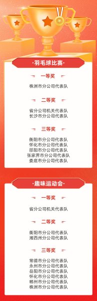 經(jīng)過為期兩天緊張激烈的角逐,株洲市分公司代表隊最終奪得羽毛球比賽冠軍,省分公司機關(guān)代表隊最終奪得趣味運動會冠軍。