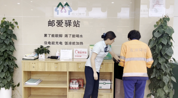 在位于重慶榮昌區(qū)行政中心地段及重要交通樞紐核心位置,網(wǎng)點(diǎn)面積達(dá)240平方米,服務(wù)人口約2.5萬人的富安郵政所,有這么一處溫暖之所:累了可以歇腳,渴了可以飲水,冬可取暖,夏可納涼,閑暇可讀書閱報(bào),這,就是榮昌郵政傾力打造的“郵愛驛站”。截至2023年9月底,重慶市郵政工會(huì)已建成戶外勞動(dòng)者服務(wù)站點(diǎn)295個(gè),每個(gè)站點(diǎn)以志愿服務(wù)為切入點(diǎn),均配備了沙發(fā)桌椅、飲水機(jī)、空調(diào)、微波爐、冰箱、充電器、應(yīng)急醫(yī)藥箱、愛心雨傘等生活服務(wù)設(shè)備設(shè)施,為環(huán)衛(wèi)工人、交警、外賣小哥、快遞員等戶外勞動(dòng)者群體和廣大市民提供貼心服務(wù)。