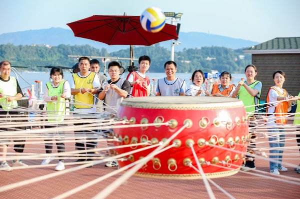 最后在“百人大鼓”游戲中,每個人都拉動一條繩子,合力將球顛起來,通過大家的努力,最終突破了20個。共同完成的時刻大家都興奮得跳了起來。游戲環(huán)節(jié)結(jié)束后,晚上的音樂晚上中,大家爭先恐后展示著才藝。有跳舞、唱歌、小品等,讓現(xiàn)場的氣氛推向了高潮。大家時而捧腹大笑,時而感動落淚。最后在《真心英雄》的大合唱中結(jié)束了本次活動。