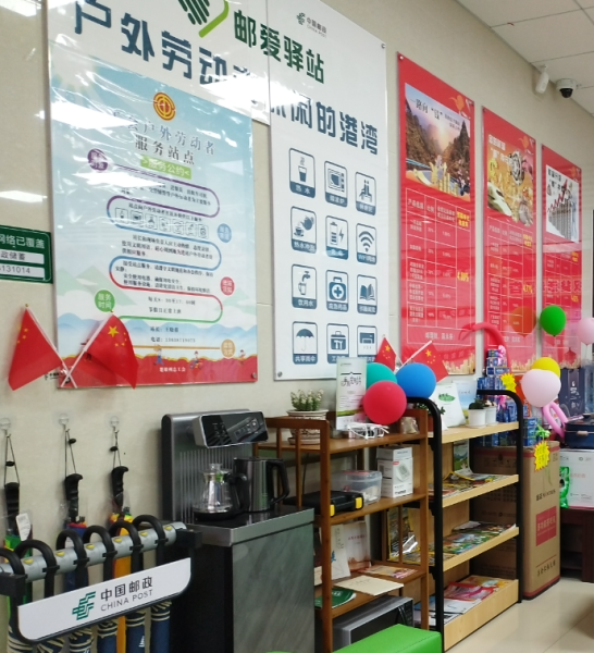 7月份起,云南郵政在全省范圍內(nèi)開始建設(shè)“郵愛驛站”,各級(jí)郵政分公司主動(dòng)與當(dāng)?shù)乜偣?huì)匯報(bào),在選址、建設(shè)內(nèi)容、宣傳上下足功夫。建站以來,“郵愛驛站”結(jié)合網(wǎng)點(diǎn)物理環(huán)境,添置冰箱、微波爐、飲水機(jī)、充電線、書報(bào)及電子閱讀、急救小藥箱、針線包等設(shè)施,切實(shí)解決戶外工作者吃飯難、喝水難、休息難的問題,同時(shí)充分整合郵政金融、寄遞、郵務(wù)資源,進(jìn)一步拓展網(wǎng)點(diǎn)服務(wù)功能,積極主動(dòng)與合作郵商對(duì)接,借助資源,為戶外工作者提供愛心義診、暖心早餐、送菜送水票等特色服務(wù)。