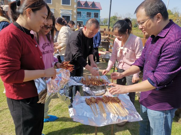 臨近中午,大家拿著自助燒烤食材,各盡所能,自制美味牛排及燒烤。午餐結束后,大家根據(jù)各自喜好,選擇不同運動場館進行運動,不愛運動的就帶著魚桿坐在河邊垂釣,帶了小寶貝的員工就到凱凱光光樂園游玩。