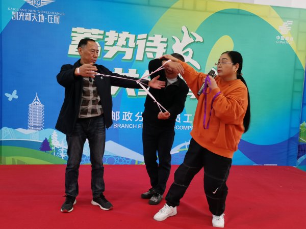 首先老師讓兩位職工代表上臺,各套上兩根繩子在雙手,兩人繩子保持交叉狀態(tài),不能借助剪刀等工具,看如何解開。大家倆倆搭檔,開始嘗試各種方法解開繩子,最后有兩個女同事率先解開了繩子。老師讓她們演示一遍給大家看,大家看完后都恍然大悟。
