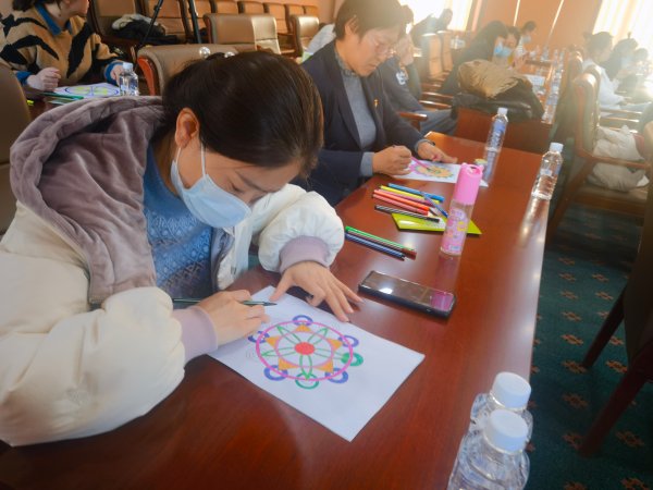 潘芙蓉老師先著重講解了《家庭教育促進法》的相關(guān)條款,老師精彩解說后,采取有獎問答的方式,激發(fā)廣大員工的參與熱情,大家爭先恐后紛紛舉手搶答,掀起一陣陣學(xué)習(xí)高潮。每個桌子上擺上了五顏六色的繪畫筆和曼陀羅圖案畫紙, 潘芙蓉老師為大家介紹了曼陀羅繪畫體驗活動的意義。曼陀羅的繪畫方式分為三種:意向曼陀羅、自性曼陀羅和涂色曼陀羅,涂色曼陀羅模板設(shè)計含有積極意義,潛意識被植入和諧、積極、美好的象征元素,凈化心靈,繪畫者遵循內(nèi)心感覺涂抹顏色。每一個圖像,都屬于內(nèi)心的幻象,這幻象正如我們的夢,如果你對自己的夢記錄下來,你會發(fā)現(xiàn)你的夢里面有很多奇奇怪怪的意象,所以曼陀羅有一種自我治愈的功能,不需要心理咨詢師,自己治療自己。