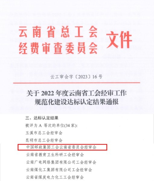 近日,云南省總工會(huì)經(jīng)費(fèi)審查委員會(huì)下發(fā)了《關(guān)于2022年度云南省工會(huì)經(jīng)審工作規(guī)范化建設(shè)達(dá)標(biāo)認(rèn)定結(jié)果通報(bào)》(云工審會(huì)字﹝2023﹞16號(hào)),云南郵政工會(huì)經(jīng)費(fèi)審查委員會(huì)被評(píng)為A等次單位,這已是云南郵政工會(huì)連續(xù)多年被獲評(píng)為A等次單位。