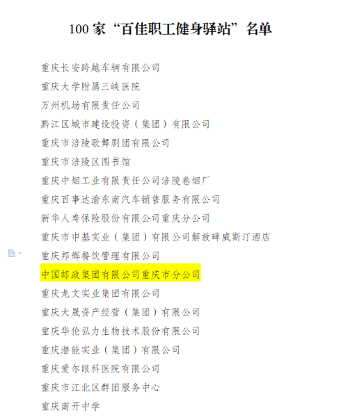 根據(jù)《重慶市總工會關于2023年“渝工關愛”活動開展情況的通報》,中國郵政集團有限公司重慶市分公司獲評重慶市“百佳職工健身驛站”。