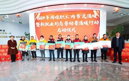 1月3日,2024年困難職工“兩節(jié)”送溫暖暨新就業(yè)形態(tài)勞動者溫暖行動啟動儀式在池州郵政分公司天堂湖支局工會驛站召開,池州市人大常委會副主任、市總工會主席紀(jì)良才,池州市民政局黨組書記、局長朱蕓蕓,池州市郵政分公司黨委副書記、副總經(jīng)理王昌武及困難企業(yè)代表、困難職工代表出席儀式。 啟動儀式上,參加活動的領(lǐng)導(dǎo)為集中區(qū)、開發(fā)區(qū)、交運集團、僑銀環(huán)衛(wèi)、快遞等行業(yè)工會和部分困難職工代表發(fā)放了慰問金。為了讓困難職工過上一個溫馨祥和的春節(jié),市總工會還聯(lián)合市慈善協(xié)會共同購買了價值20萬元的本地糧油等生活必需品,向500名困難職工群體發(fā)放新春大禮包,物品供給和配送工作由市郵政公司全力保障。