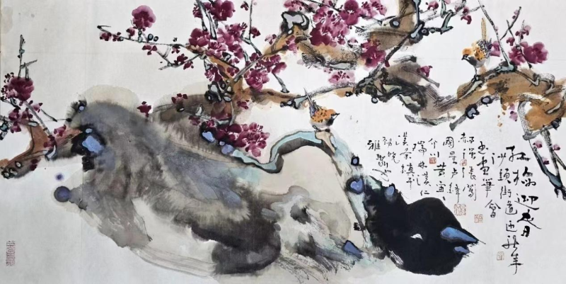 值得一提的是,當(dāng)天藝術(shù)家們現(xiàn)場合作繪制了一幅《紅梅迎春圖》,梅花是春節(jié)期間家家戶戶常見的裝飾品,有傳春報(bào)喜的寓意,在中國傳統(tǒng)文化中,梅花更象征著吉祥和平安,梅花五瓣傳遞著快樂、幸福、長壽、順利、和平的五福祝愿。藝術(shù)家們將這一份美好的新春祝福贈(zèng)與現(xiàn)場的每一位領(lǐng)導(dǎo)、嘉賓及各位郵政員工、社區(qū)居民。