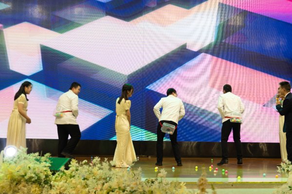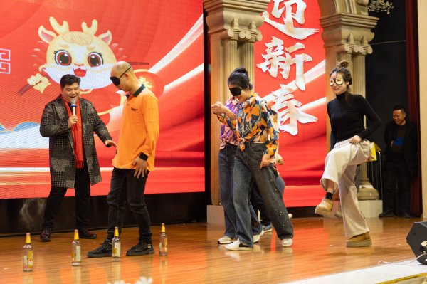 晚會中間還穿插了游戲環(huán)節(jié):蒙眼過河和公雞下蛋。蒙眼過河,選手上臺都用眼罩蒙住雙眼,空瓶擺放在活動區(qū)域作為障礙物,選手不碰到障礙物順利過河就算過關(guān),大家都是把腿抬得高高,緩緩落地,動作機(jī)械搞笑,引得臺下觀眾爆笑連連。公雞下蛋的三名男選手在場上瘋狂扭腰,扭得最好的蛋下得最多。