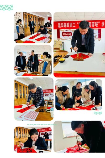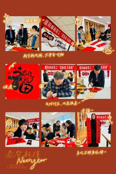 新年伊始,春節(jié)降至。為豐富職工精神文化生活,營(yíng)造歡樂(lè)吉祥、溫暖和順的節(jié)日氛圍,增強(qiáng)企業(yè)凝聚力,1月25日,濮陽(yáng)市郵政工會(huì)組織職工開(kāi)展“迎新春 寫(xiě)春聯(lián)”活動(dòng)。活動(dòng)邀請(qǐng)擅長(zhǎng)書(shū)法的郵政干部現(xiàn)場(chǎng)揮毫潑墨,熱情高漲的職工們臨場(chǎng)發(fā)揮筆走龍蛇,一幅幅寓意吉祥、充滿(mǎn)祝福的春聯(lián)和“?!弊周S然紙上,用不同的字體、不同的風(fēng)格,為大家送上美好的新春祝福。整個(gè)活動(dòng)氣氛熱烈,展示了郵政職工良好的精神風(fēng)貌。新的一年,濮陽(yáng)郵政干部職工將以更加昂揚(yáng)的工作作風(fēng),更加飽滿(mǎn)的精神狀態(tài),穩(wěn)步實(shí)干,為公司的高質(zhì)量發(fā)展貢獻(xiàn)力量。(河南省郵政工會(huì))