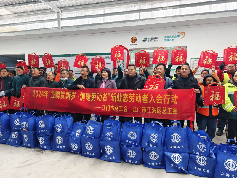 活動現(xiàn)場,江海區(qū)總工會同時(shí)開展了“龍騰賀新歲·情暖勞動者”新業(yè)態(tài)勞動者入會行動,為貨車司機(jī)、快遞員送上龍年祝福和新年大禮包。