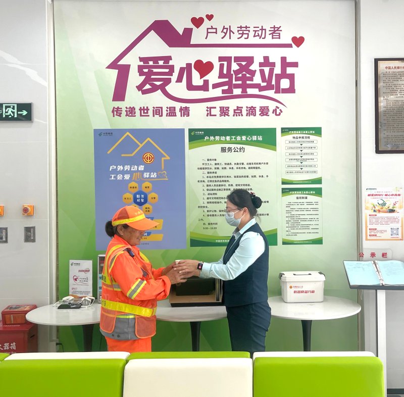 在汕頭郵政鴻雁營業(yè)所工會(huì)驛站,常有附近的環(huán)衛(wèi)工人進(jìn)來歇腳,網(wǎng)點(diǎn)工作人員總是熱情接待,為他們送上一杯水、一句問候。傳遞工會(huì)溫暖,豐富服務(wù)內(nèi)涵,汕頭郵政每一個(gè)工會(huì)驛站均設(shè)置免費(fèi)充電、緊急避雨、免費(fèi)熱水、免費(fèi)網(wǎng)絡(luò)、臨時(shí)休息五大功能,為廣大市民及戶外勞動(dòng)工作者提供了貼心、便利的服務(wù)。