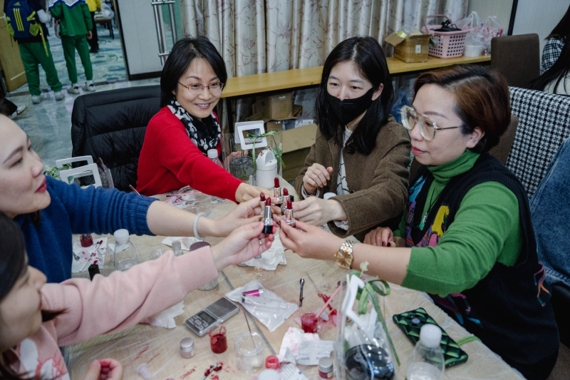 “白雪凝瓊貌,明珠點(diǎn)絳唇”,口紅的制作工藝在歷朝歷代的研究和創(chuàng)新下愈發(fā)精良精巧。選色稱重、攪拌溶解、定型脫模,女職工們在老師的指導(dǎo)下,按照步驟精心操作,最終呈現(xiàn)出了一抹抹嬌艷欲滴的色彩。