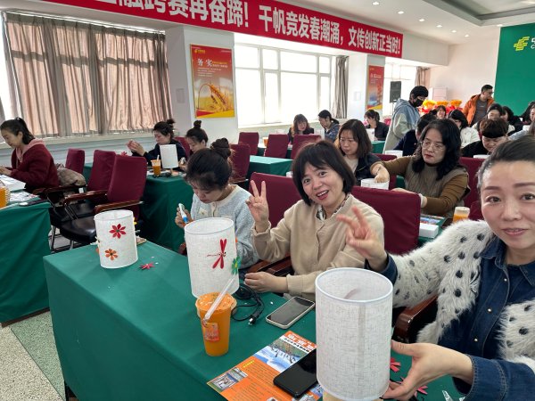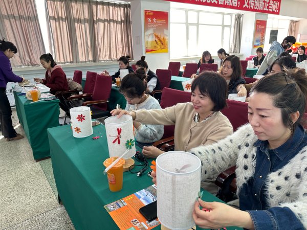 活動現(xiàn)場,經(jīng)驗(yàn)豐富的草編工藝品老師以“播放視頻+現(xiàn)場演示”的方式給大家講解草編手工藝品制作,隨后各位“女神”親自動手,將用玉米葉等原生態(tài)農(nóng)作物制作成的花朵,按照自己的創(chuàng)意粘貼在壓花臺燈上,一份份燦爛繽紛、新穎別致的壓花臺燈作品呈現(xiàn)在眼前。