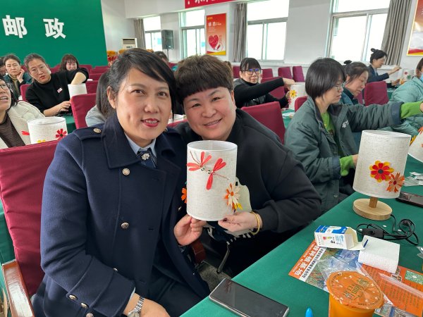 女職工們拿起壓花臺燈作品,擺好pose,或是自拍、或是合照,臉上都洋溢著幸福的笑容。