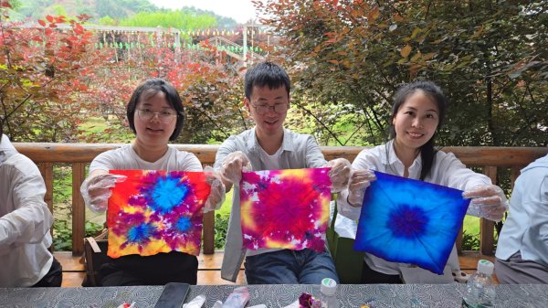 通過小游戲環(huán)節(jié),大家的團(tuán)隊協(xié)作意識進(jìn)一步增強(qiáng)。“舞龍”環(huán)節(jié)是用氣球編織龍身,各個小組完成舞龍規(guī)定動作?,F(xiàn)場4支隊伍你追我趕,互相競爭,大家表演各種“自創(chuàng)動作”,翻江倒海、雙龍戲珠......現(xiàn)場一片熱鬧景象;小游戲“賣西瓜”環(huán)節(jié)考驗隊員的反映速度及團(tuán)隊意識,通過不同隊員自由組合達(dá)到目標(biāo)。學(xué)習(xí)“扎染”環(huán)節(jié),大家首先跟隨老師了解了扎染的歷史和工藝,隨后大家自己動手制作,不多時,一條條色彩斑斕的手帕便紛紛出現(xiàn)在大家面前。