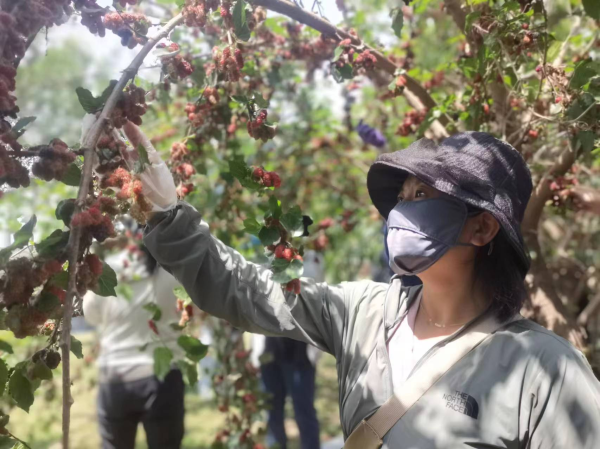 在園區(qū)內(nèi)的桑樹林中,一顆顆紫紅的桑葚壓彎了樹枝,大家在園區(qū)內(nèi)漫步采摘,享受這難得的閑暇時光。