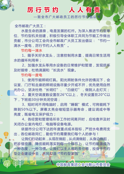 為深入推進(jìn)節(jié)約型單位、節(jié)約型機(jī)關(guān)創(chuàng)建,根據(jù)安徽省公司《關(guān)于進(jìn)一步厲行節(jié)約堅(jiān)持過(guò)緊日子的通知》要求,積極引導(dǎo)全體員工共同為節(jié)能工作做出貢獻(xiàn),馬鞍山政郵工會(huì)向全市郵政廣大會(huì)員、員工發(fā)出倡議:“節(jié)約一滴水一度電,厲行節(jié)約人人有責(zé)”。本次倡議依據(jù)市分公司下達(dá)的年度重點(diǎn)成本指標(biāo),嚴(yán)控水電費(fèi)用支出,倡導(dǎo)勤儉節(jié)約需要我們每個(gè)人的參與,從現(xiàn)在做起,從點(diǎn)滴做起,從身邊做起,把珍惜資源、降低能耗落實(shí)到每一個(gè)細(xì)節(jié)上,讓節(jié)約能源成為一種態(tài)度,一種習(xí)慣。讓我們以主人翁的責(zé)任感,投身于節(jié)約型企業(yè)建設(shè)中去,共同打造“節(jié)約型郵政家園”