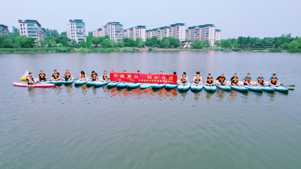 經(jīng)過教練認(rèn)真講解,大家快速了解了槳板運(yùn)動(dòng)的操作規(guī)范和動(dòng)作要領(lǐng)。做好安全措施后,一人一板一槳,大家勇敢開啟難忘的水上之旅。微風(fēng)拂面,垂柳慢搖,在波光粼粼的湖面上,大家從開始的陌生緊張,逐漸放松,慢慢的便可穩(wěn)坐在槳板上劃水前行了。膽大一些的,甚至可以在板上站立起來做高難度動(dòng)作了。落水了也沒關(guān)系,按照動(dòng)作要領(lǐng)調(diào)整身姿,再次翻身上板,繼續(xù)前行。