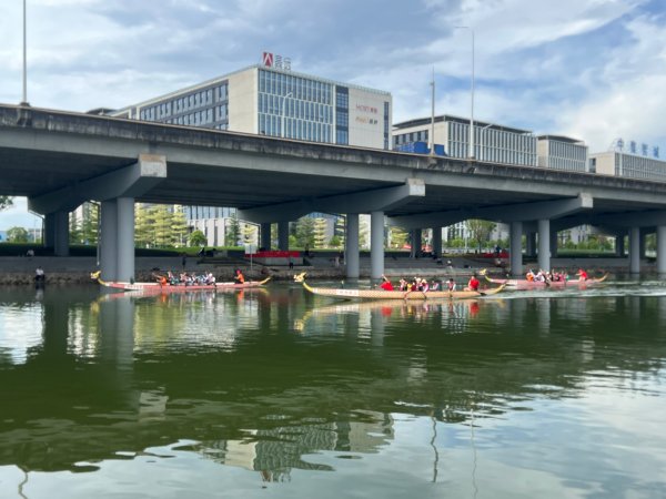 本次活動分成了3支精英小隊(duì),隊(duì)員由各部室員工隨機(jī)組成,余下的自行組成啦啦隊(duì)。熱身過后的各個(gè)隊(duì)伍紛紛展開了賽前的訓(xùn)練,在教練講解賽龍舟的三要素“人齊、心齊、動作齊”后,各組隊(duì)員按照指導(dǎo),練習(xí)起手、劃槳、轉(zhuǎn)身等動作。伴隨著整齊劃一的口號聲,河道上一場激烈的龍舟賽即將開始。