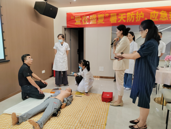 培訓(xùn)中,授課老師從暑天防護(hù)、中暑的不同癥狀表現(xiàn)及應(yīng)對處理、突發(fā)狀況應(yīng)急搶救、AED使用等方面進(jìn)行了詳細(xì)講解和實(shí)操培訓(xùn)。員工們踴躍上臺體驗(yàn),按觀察環(huán)境、確認(rèn)體征、指揮呼叫、打開氣道、定位按壓、輔助吹氣、AED操作等“黃金四分鐘”流程依次演練,并積極與老師進(jìn)行互動(dòng)交流。