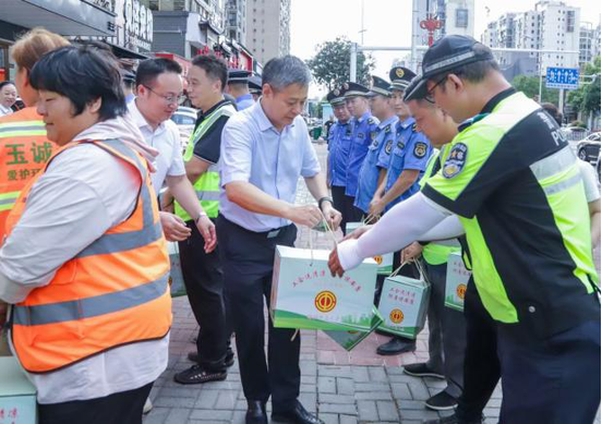 “大家辛苦了!無論酷暑還是嚴(yán)寒,你們都在一線堅守,為城市的干凈整潔和交通的平安順暢辛勤工作、默默付出。你們是這座城市靚麗的風(fēng)景線?!眹?yán)華書記將清涼用品送到交警、環(huán)衛(wèi)工人、城管工作人員手中,并致以誠摯問候,叮囑他們合理安排工作時間,做好勞動期間高溫保護工作。同時要求有關(guān)部門落實好勞動保護和防暑降溫各項措施,改善工作條件,管理好戶外勞動者驛站,切實保障高溫一線勞動者身心健康,確保大家工作安全、生活安心。