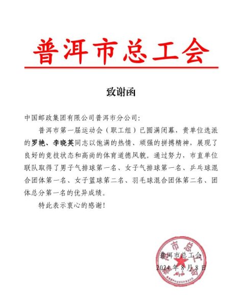 經(jīng)過激烈比拼,普洱總工會、普洱市社科聯(lián)和普洱郵政聯(lián)合代表隊分別包攬了男子氣排球第一名、女子氣排球第一名,乒乓球混合團體第一名、女子籃球第二名、羽毛球混合團體第二名、取得了團體總分第一名的優(yōu)異成績,普洱市總工會向普洱市郵政工會發(fā)來了積極選拔優(yōu)秀參賽隊員的致謝函!