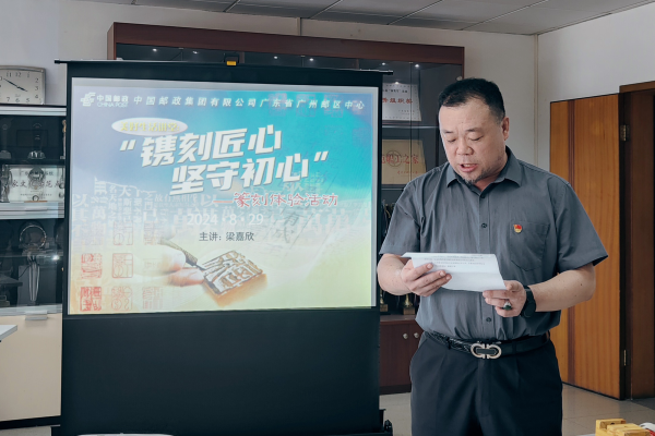 活動伊始,廣州郵區(qū)中心工會副主席高東林作了熱情洋溢的致辭。他表示:“在這個快節(jié)奏的時代,我們往往容易忽略那些需要耐心與專注才能成就的美好。今天,我們相聚在這里,通過篆刻這一古老而又充滿智慧的藝術(shù)形式,不僅是要體驗一種技藝的傳承,更重要的是要學(xué)習(xí)那份‘鐫刻匠心,堅守初心’的精神。希望每一位參與者都能從篆刻的每一刀、每一劃中,感悟到對工作的執(zhí)著與熱愛,對生活的細膩與溫情。”