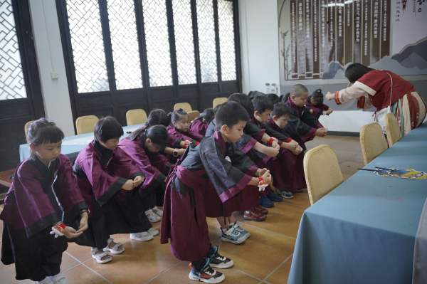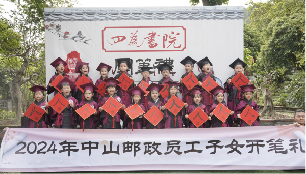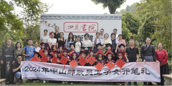 8月24日上午,晨光初照,19位即將入讀小學(xué)一年級(jí)的員工子女身穿傳統(tǒng)服飾,在父母的陪伴下,踏入古色古香的中山詹園孝道館,參加中山市郵政工會(huì)組織的“開筆禮”活動(dòng)。