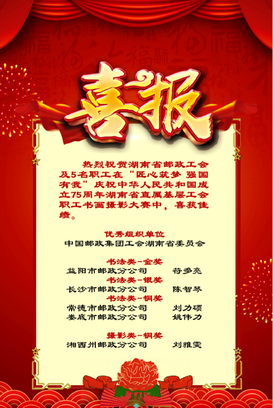 近日,在湖南省直工委會(huì)舉辦的“匠心筑夢(mèng) 強(qiáng)國(guó)有我”慶祝中華人民共和國(guó)成立75周年職工書畫攝影大賽中,中國(guó)郵政集團(tuán)工會(huì)湖南省委員會(huì)喜獲“優(yōu)秀組織獎(jiǎng)”;益陽市郵政分公司職工符多亮榮獲書法類金獎(jiǎng);長(zhǎng)沙市郵政分公司職工陳智琴榮獲書法類銀獎(jiǎng);常德市郵政分公司職工劉力碩、婁底市郵政分公司職工姚偉力榮獲書法類銅獎(jiǎng); 湘西州郵政分公司職工劉雅雯獲攝影類銅獎(jiǎng)。